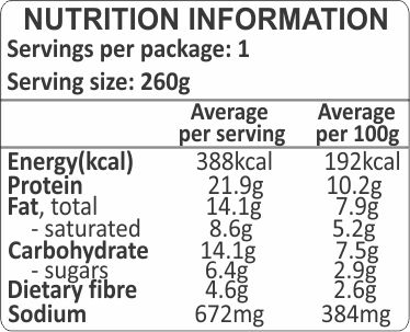 The summer breakfast features a nutritious combination of ingredients, including beef chipolata (37%) and whole eggs (27%), complemented by cannellini beans (23%) and potato (22%). Enhanced with extra virgin olive oil, salt, and black pepper, this dish is seasoned with Italian mixed herbs for an aromatic flavor profile. The accompanying tomato salsa, consisting of tomatoes (66%), onion (15%), capsicum, vinegar, and various spices, adds a refreshing zest. Additionally, fresh ginger, garlic, and reduced salt soy sauce, along with a garnish of spring onion, contribute to the overall culinary experience. This meal contains milk, egg products, and wheat.